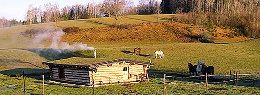Ce modèle de cabane vient des régions des pays de l'Est - Pologne, Russie. Les bûcherons s'y abritent par mauvais temps - pluie, neige. Tous les matériaux de construction sont pris dans la forêt. Les chevaux utilisés pour le débardage peuvent se mettre au sec dans des abris faits de piles de bois et de branchages pour le toit.